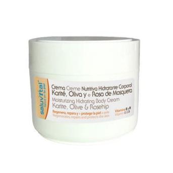 Saluvital Crema Nutritiva Karité, Oliva Y Rosa Mosqueta 200 ml. Tratamiento corporal nutritivo e hidratante elaborado a base de manteca de karité, aceite de oliva y rosa mosqueta. Rica en vitaminas E y B. No resulta grasa y se extiende fácilmente. Saluvital Crema Nutritiva Karité, Oliva Y Rosa Mosqueta